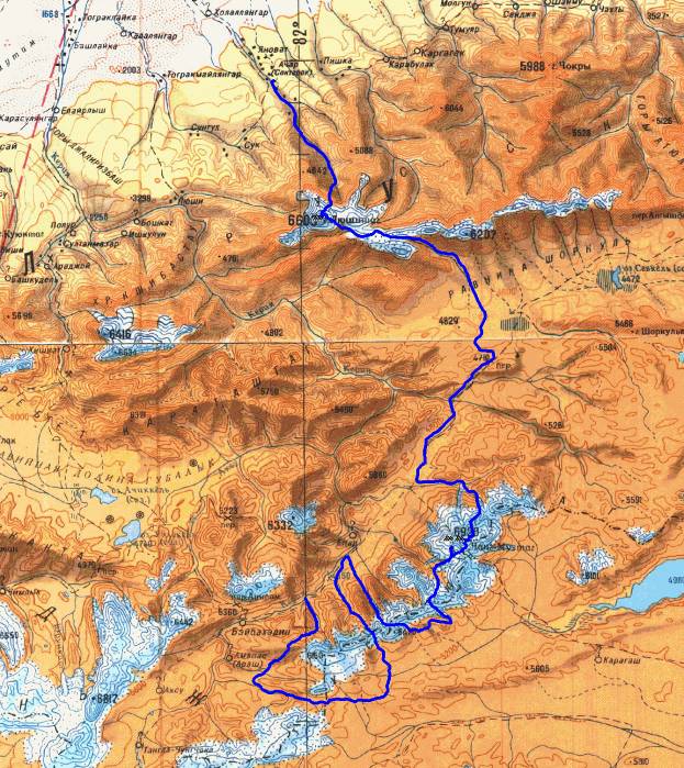 г.Москва – г.Урумчи – г.Ния - к.Карасай – р.Толан-ходжа – равн.Шор-куль – р.Керия – пер.5315  – пер.5520– пер.5340– р.Верх.Керия – пер.5610  – тибет. нагорье – пер.6060  – р.Керия – пер. 6170– тибет. нагорье – пер.6290  – в.6946 + пер.6500  –р.Чонг-Музтаг – пер.Акстоссай – р.Пр.Керия – равн.Шор-Куль – р.Сев.Шор-Куль – пер. Русское плато 5670– в.Люш-таг 6670  – пер.Вост.Люши 6150 – р.Ачан – к.Ачан – г.Хотан – г.Урумчи – г.Новосибирск – г.Москва