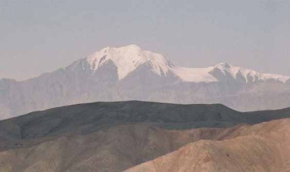 Чонг-Музтаг с севера. Вершина 6946 чуть выглядывает из-за более низкой 6780 к востоку от Чонг-Музтага.