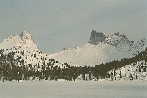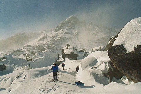 …глубокое тропление на озере Светлом не мешает наблюдать пики Звездный и Птица…
